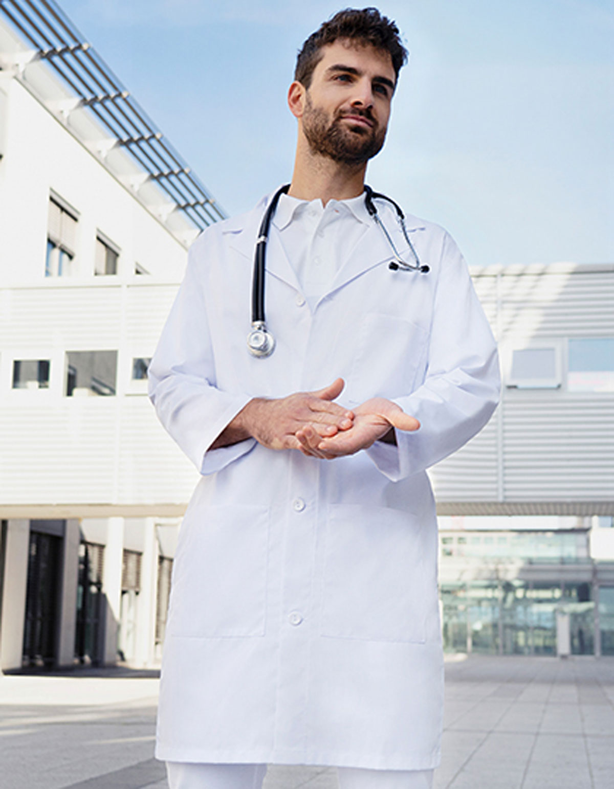 Ärzte Herrenmantel in lockerer Passform Köpergewebe, 100% BaumwolleReverskragen2 aufgesetzte Seitentaschen1 aufgesetzte Brusttasche links4 KnöpfeWaschbar bis 60°C185 g/m²