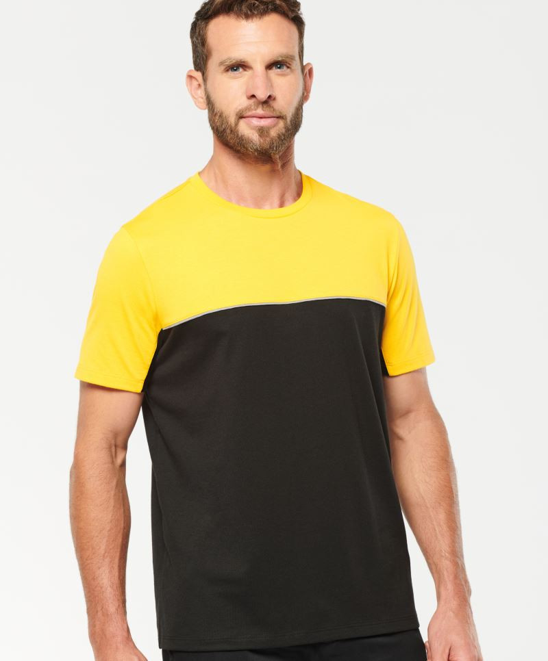 Strapazierfähiges und pflegeleichtes Herren-T-Shirt mit Kontrasteinsätzen Material: 180g/m², 50% gekämmte ringgesponnene Bio-Baumwolle, 50% recyceltes Polyester Rundhalsausschnitt mit Elasthan, Nackenband, Einsätze in Kontrastfarbe an Seite und Schulter, strapazierfähig, 60° waschbar, trocknergeeignet Grössen: XS – 6XL
