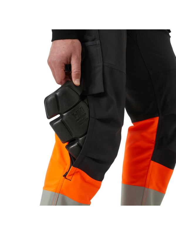 Der 2-Wege-Stretchstoff und der Zwickel im Schritt ermöglichen eine optimale Bewegungsfreiheit, während die Transferdruck-Reflexstreifen an den Beinen für eine exzellente Sichtbarkeit bei allen Lichtverhältnissen sorgen. Die Hose ist mit einer multifunktionalen Tasche am Oberschenkel, Cargotaschen mit Patte für Zubehör oder Werkzeug, Zollstocktasche mit Knopf zum Befestigen eines Messers und einer Ausweisschlaufe unter Patte ausgestattet. Die Zollstocktasche ist mit Cordura® verstärkt, was sie besonders langlebig macht.