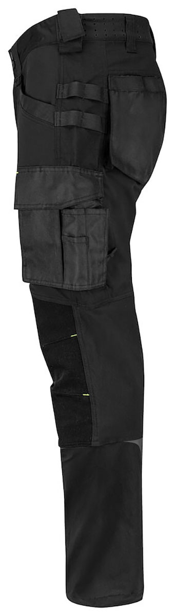 Lüftungsöffnungen mit Reissverschluss und Mesh entlang beider Beine. Elastischer Mesheinsatz am Hosenbund erhöht den Tragekomfort. Zwei Hammerschlaufen. Linkes Bein eine Cargotaschen mit Unterteilungen für Schreibutensilien und Handy mit Magnet verschliessbar; am rechten Bein eine aufgenähte Metertasche mit weiteren Unterteilungen für Werkzeug. Reflektierende Details für erhöhte Sichtbarkeit in der Dunkelheit. Regulierbare Beinabschlüsse. Vorgeformte Knie sind mit Stretch-Kevlar verstärkt. Hängetaschen und untere Innenseite der Beine sind mit Cordura® verstärkt. Gesässtaschen sind in Cordura® gearbeitet.